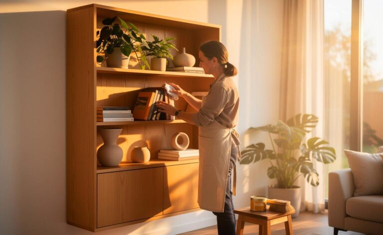 Ein Tischler zeigt, wie Naturholzregale das Raumklima durch Feuchtepufferung und geringe VOCs verbessern – inkl. Holzarten, Zertifikate und Pflege-Tipps.